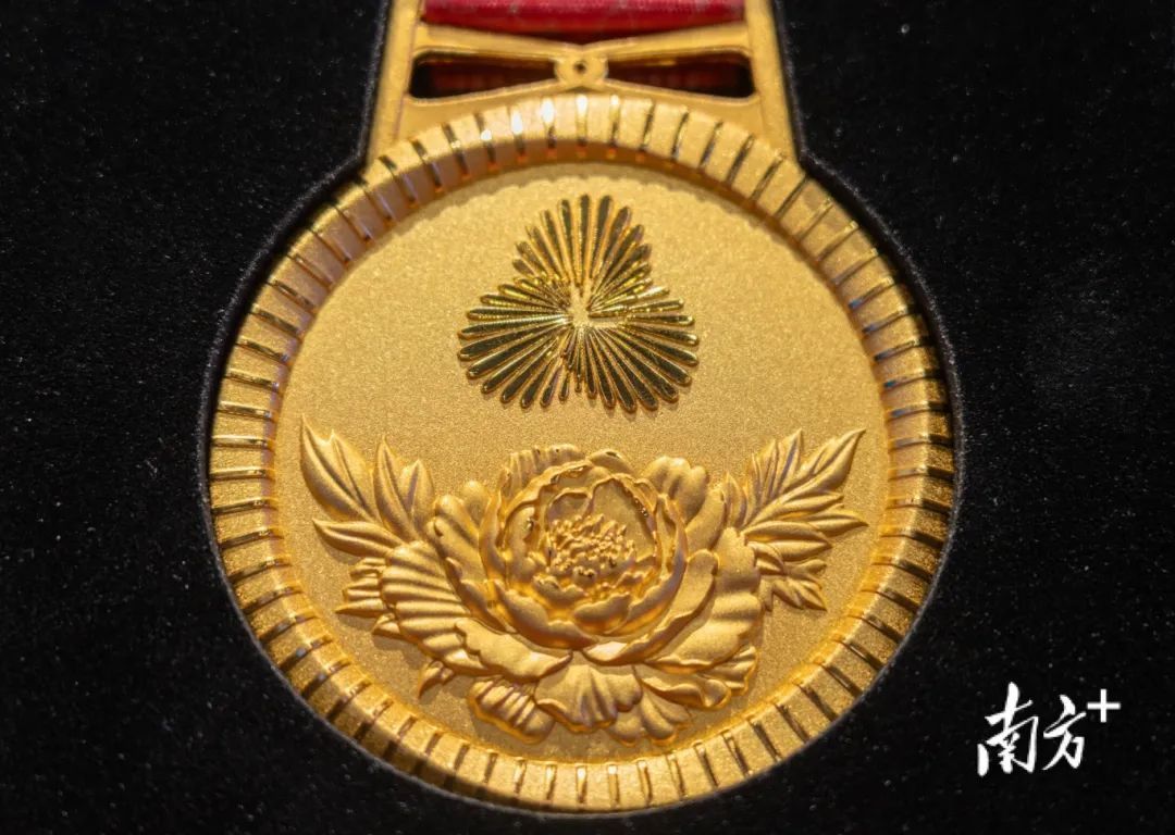 奖牌的一面,十五运会的会徽以三组递进式层次的立体结构呈现,突显三地礼花元素。“会徽的位置在中偏上。而在会徽的正下方,我们用牡丹象征祖国,诠释粤港澳大湾区在祖国的怀抱中蓬勃发展,绽放于世界舞台。”